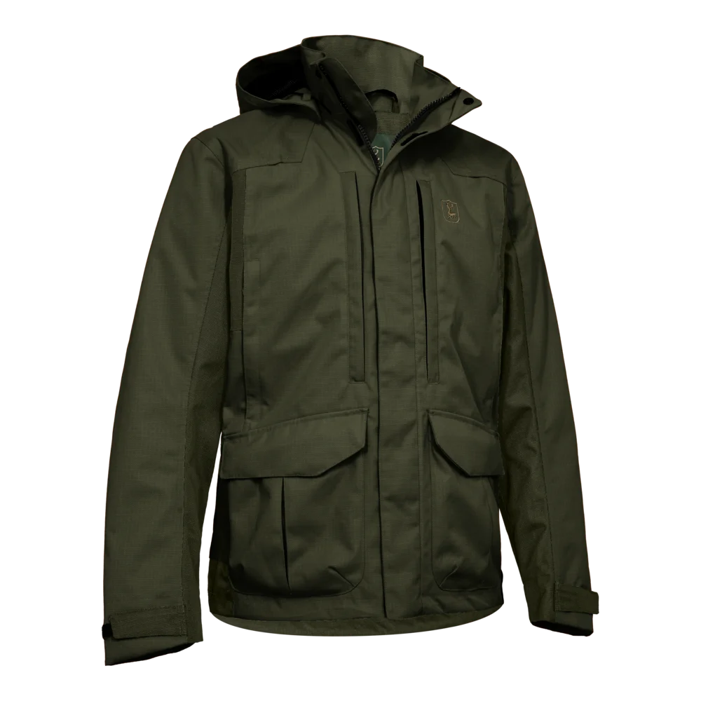 Slidstærk jagtjakke i ripstop med stræk og aftagelig hætte. Vandtæt, vindtæt og åndbar med ventilation, mange lommer og god bevægelsesfrihed.